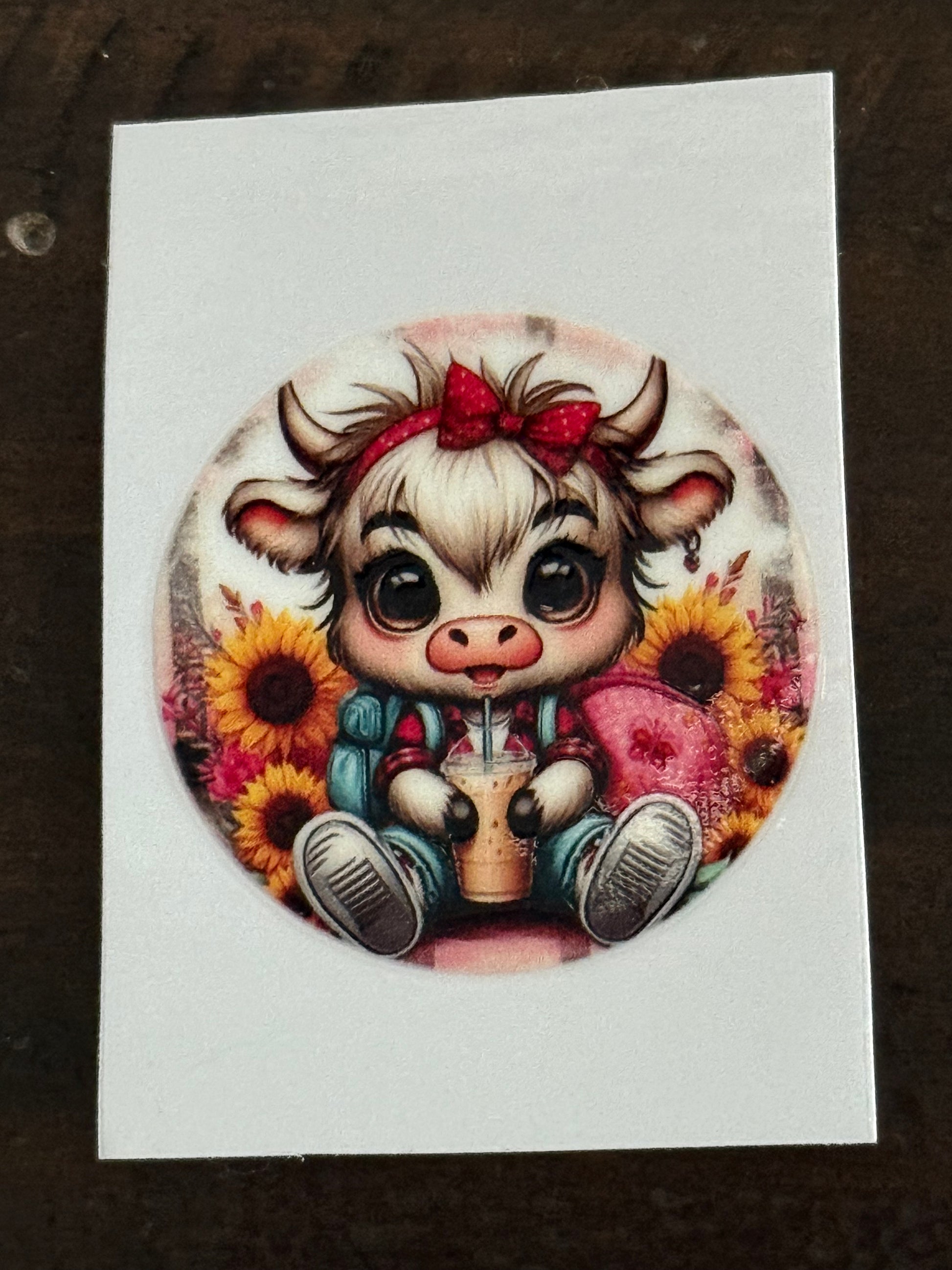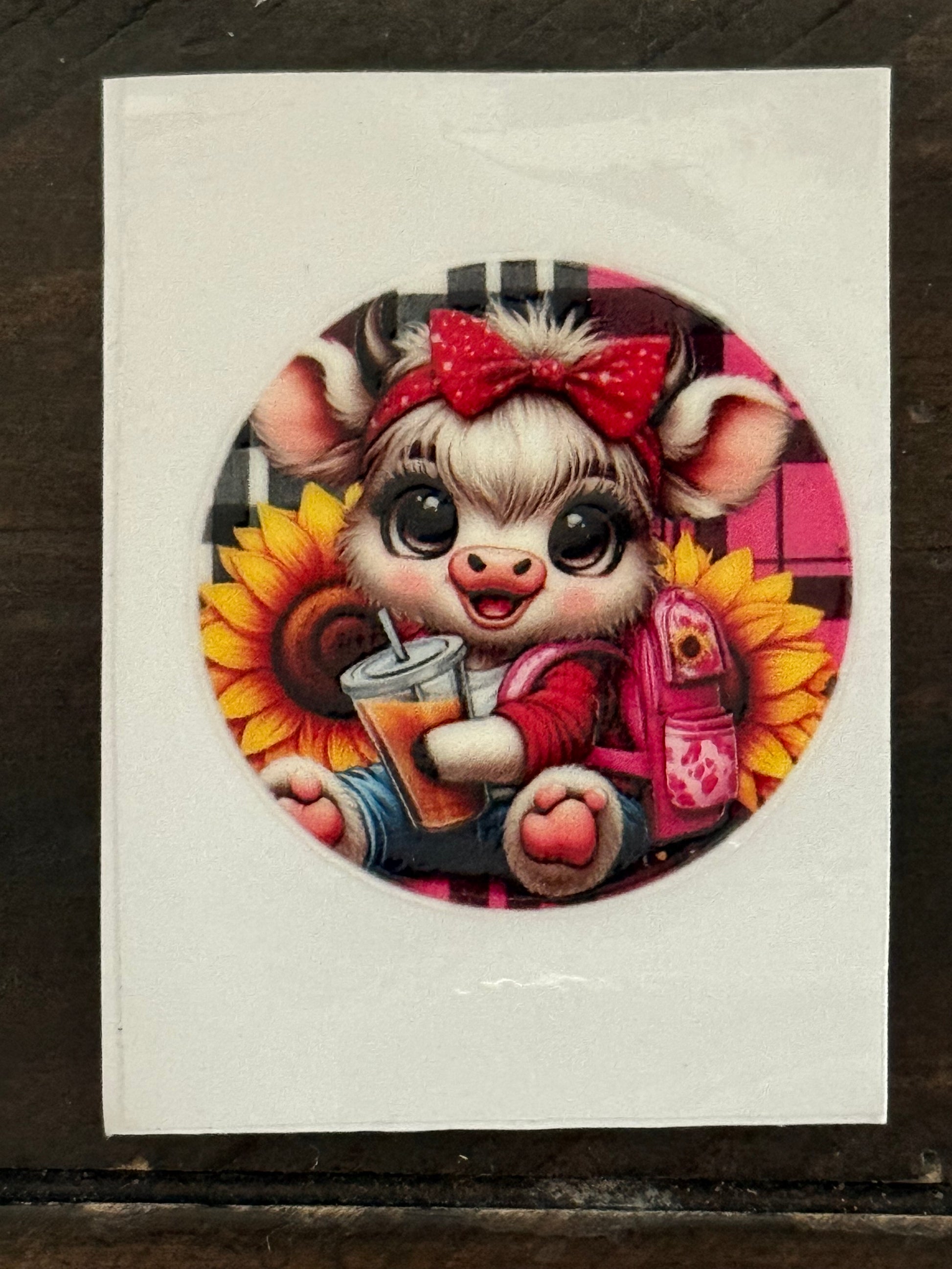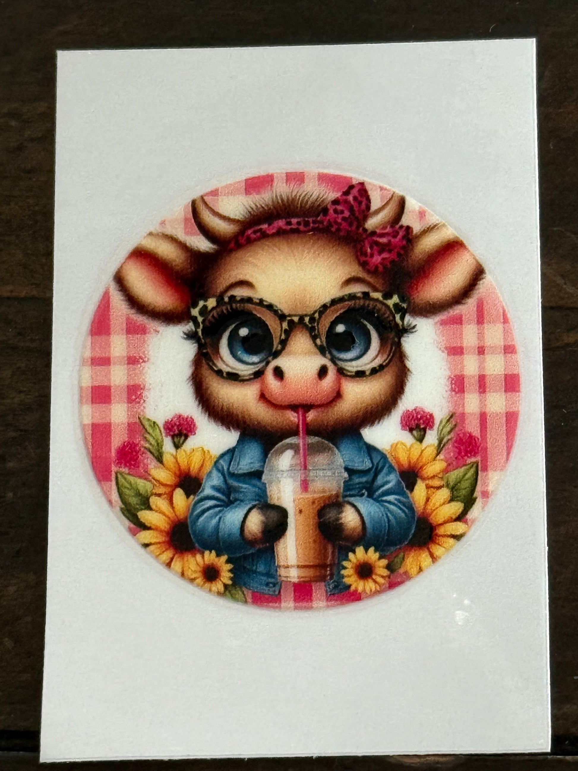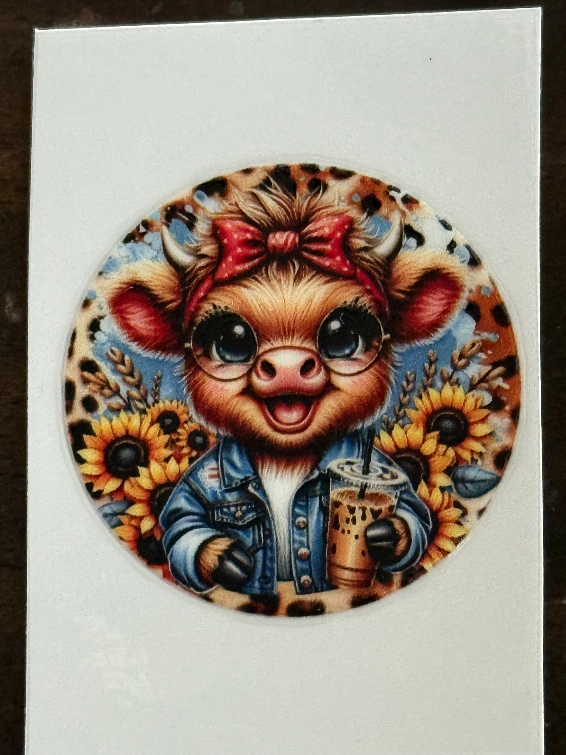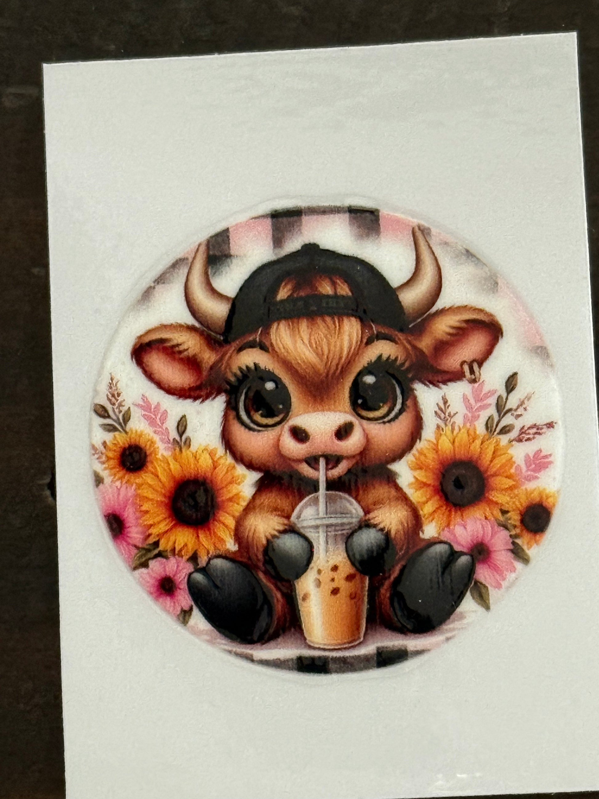 Add a touch of charm to your crafts with this adorable Highland cow UV DTF decal! Featuring a cute cow with sunflowers, boba drink, glasses, and trendy accessories, this 2x2 waterproof sticker is perfect for decorating cups, tumblers, glassware, notebooks, laptops, and more.
